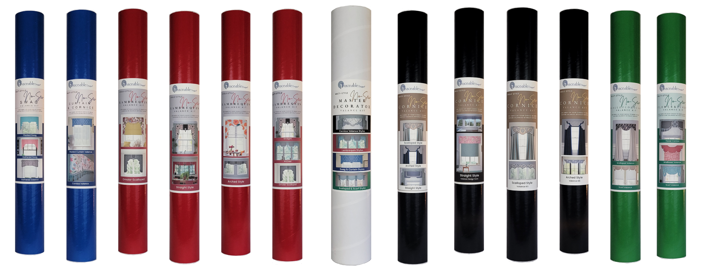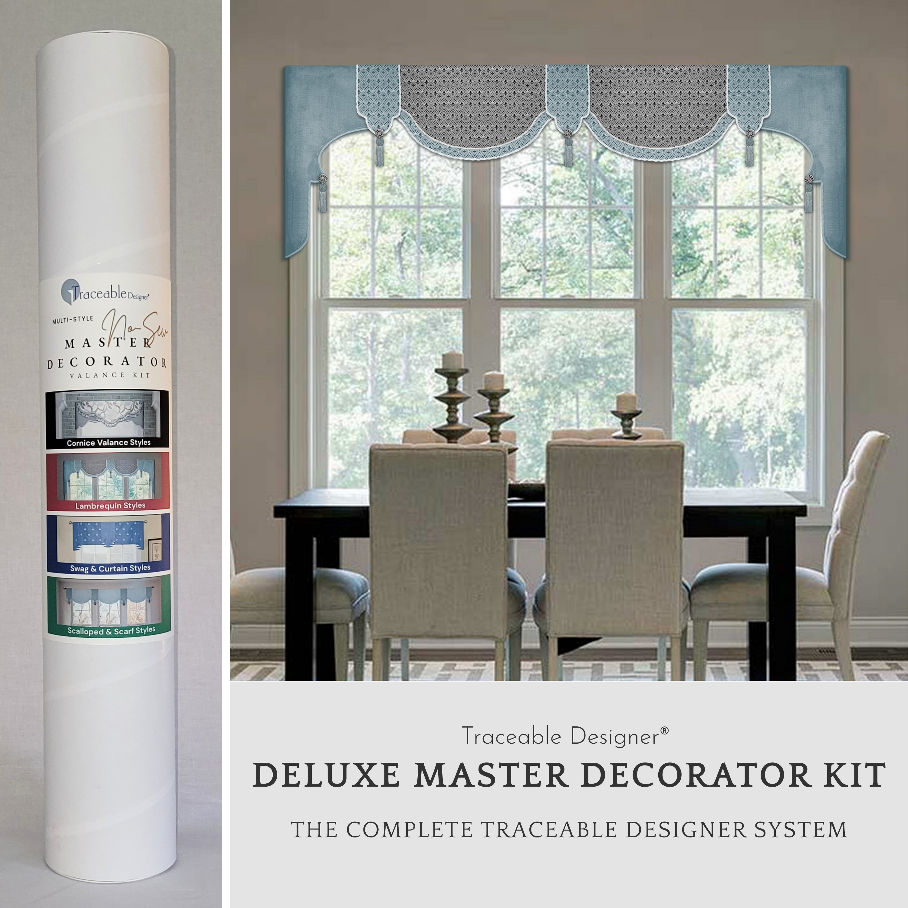 The Traceable Designer® Deluxe Master Decorator Kit brings every patented form together in one complete decorating system. Create any valance style–cornice, lambrequin, scalloped, arched, straight, pleated, gathered, swag, or jabot–plus matching tabletop accents, all without sewing. Each reusable form works with our patented slide-and-trace process and no-sew rod-pocket design to deliver crisp, professional results from any fabric. It's the ultimate all-in-one kit for mastering custom window and home decor without sewing.