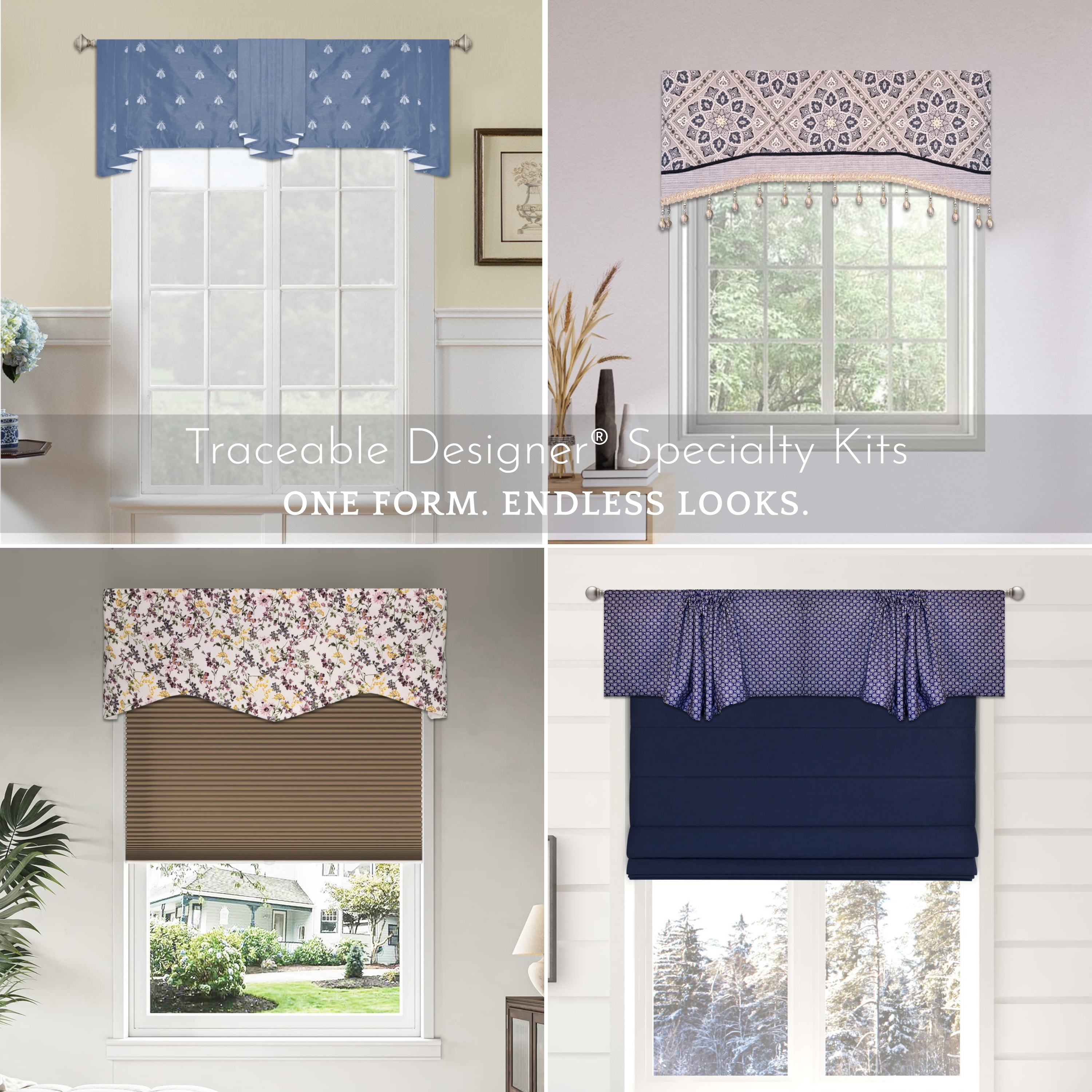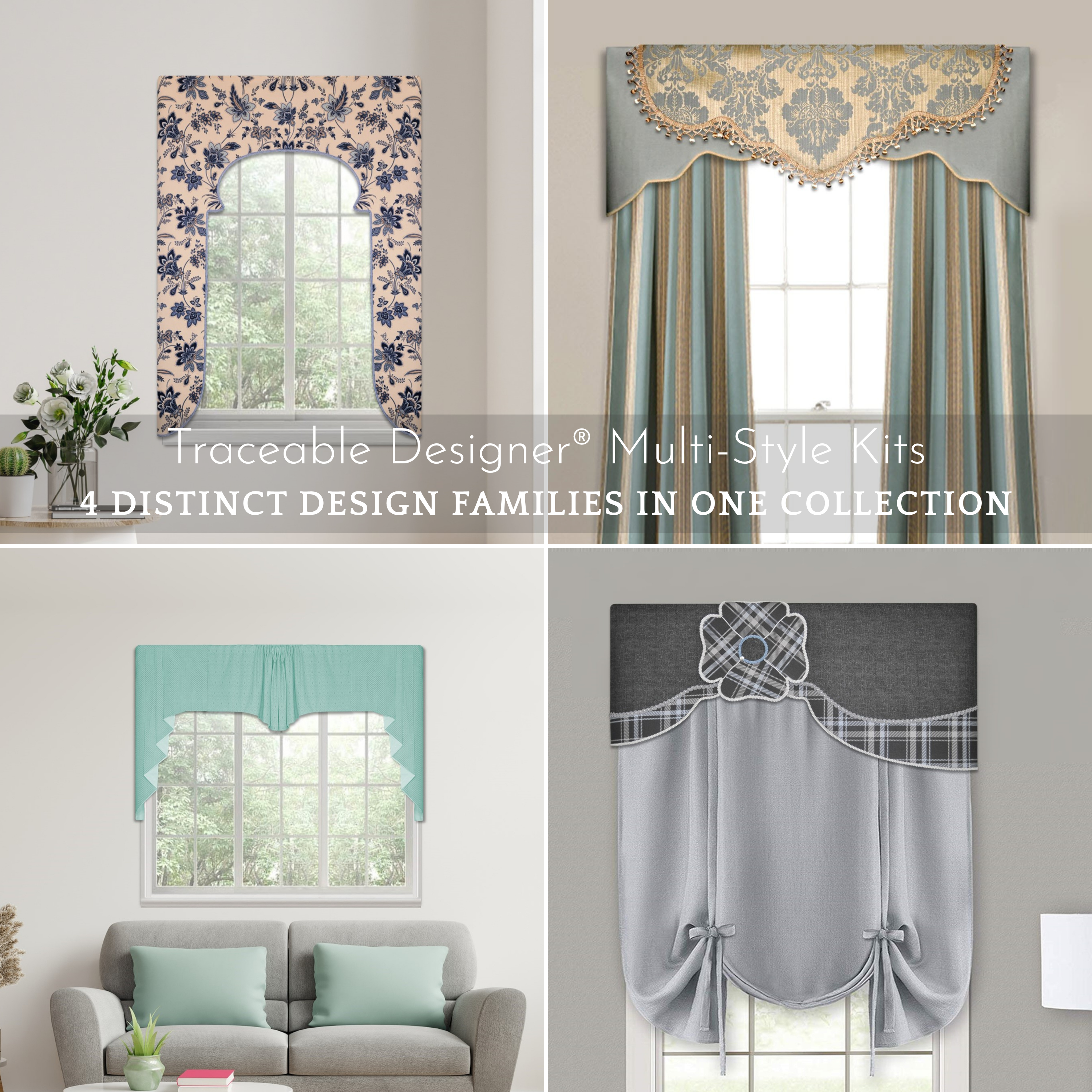 Each kit includes reusable Traceable Designer® forms that let you trace, cut, and hang perfectly shaped panels in munutes – no sewing required.