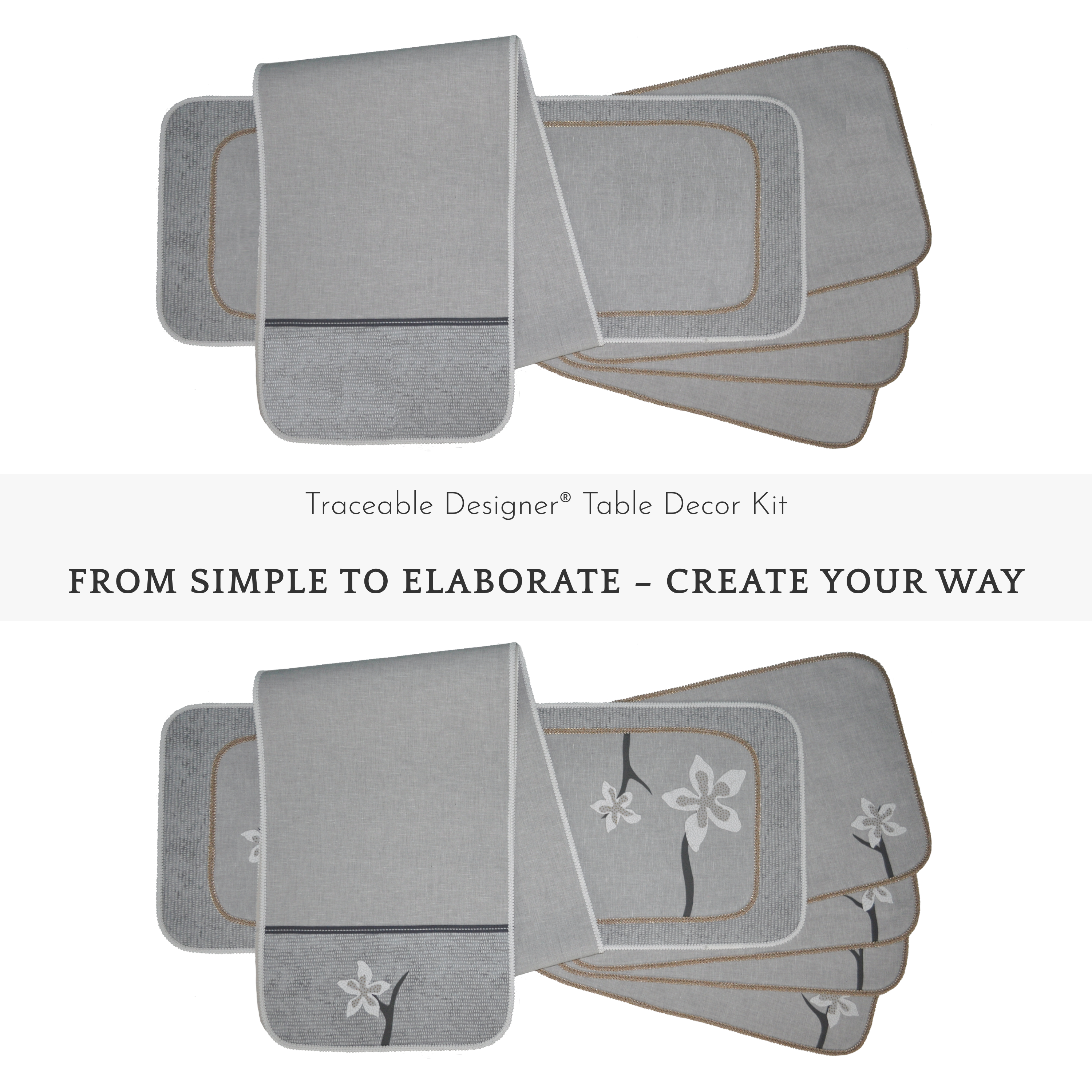 The Traceable Designer® Table Decorating Kit includes four reusable design forms that create seven unique shapes for runners, placemats, dresser scarves, and centerpiece mats. Mix and match curved, V-shaped, arched, scalloped, and straight-edge designs – each traced directly from the form for perfectly shaped, professional resuts every time. Use the same patented Slide-and-Trace system found in our window valance kits to make simple single- or dual-fabric table accents, or build layered fabric art by tracing numbered floral, fruit, and branch shapes from the included pattern sheets. Each piece aligns perfectly for crisp, professional results – no artistic skill or sewing required.
