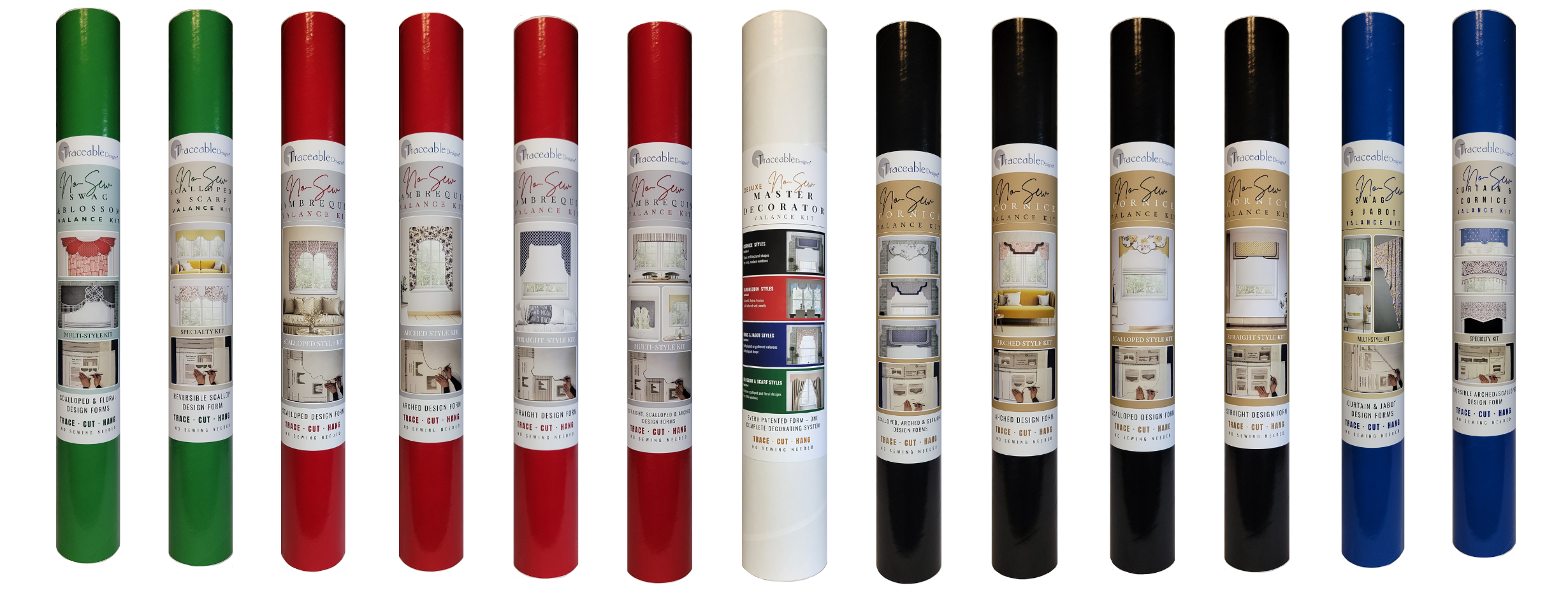 The Traceable Designer® Deluxe Master Decorator Kit brings every patented form together in one complete decorating system. Create any valance style–cornice, lambrequin, scalloped, arched, straight, pleated, gathered, swag, or jabot–plus matching tabletop accents, all without sewing. Each reusable form works with our patented slide-and-trace process and no-sew rod-pocket design to deliver crisp, professional results from any fabric. It's the ultimate all-in-one kit for mastering custom window and home decor without sewing.